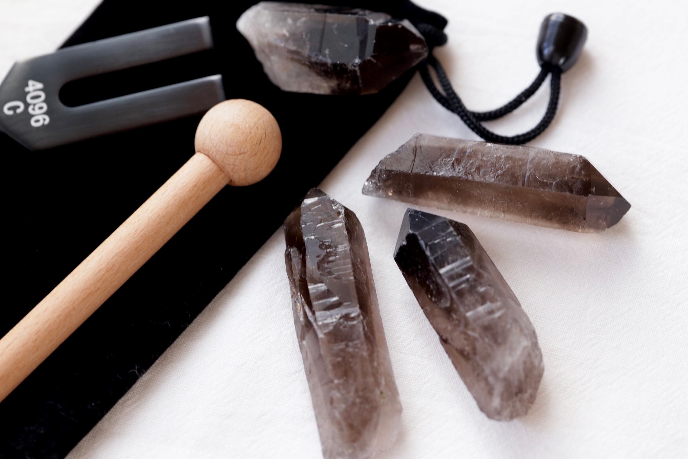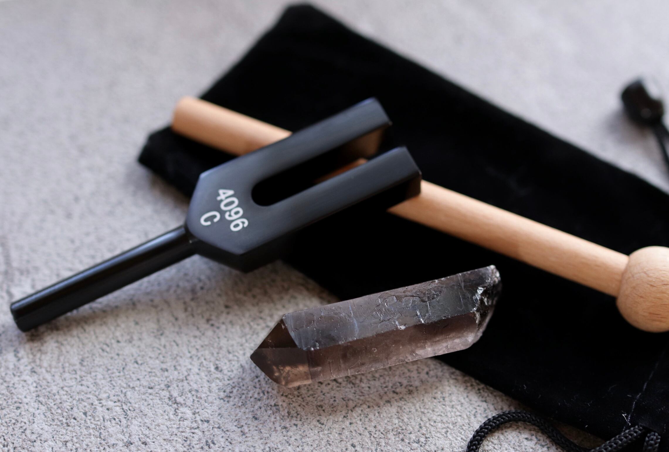 ✧スモーキークォーツのポイント原石と、ブラックカラーの音叉を組み合わせた、魔除け&グラウディングに特化したヒーリングセット。