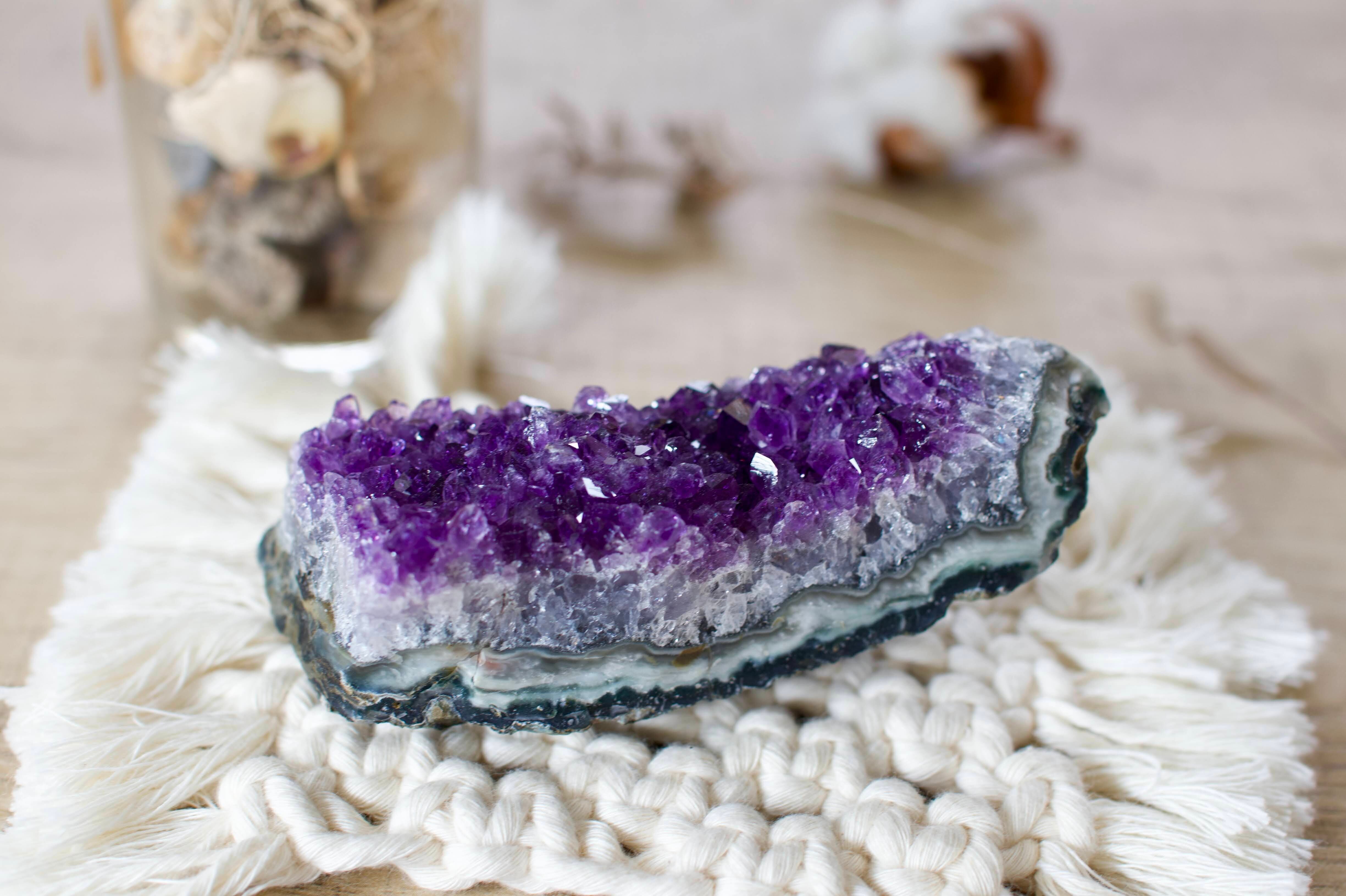 アメジストの原石は自浄作用があるので、ほとんど浄化はいりませんが、セージ、流水、月光浴などがおすすめです。