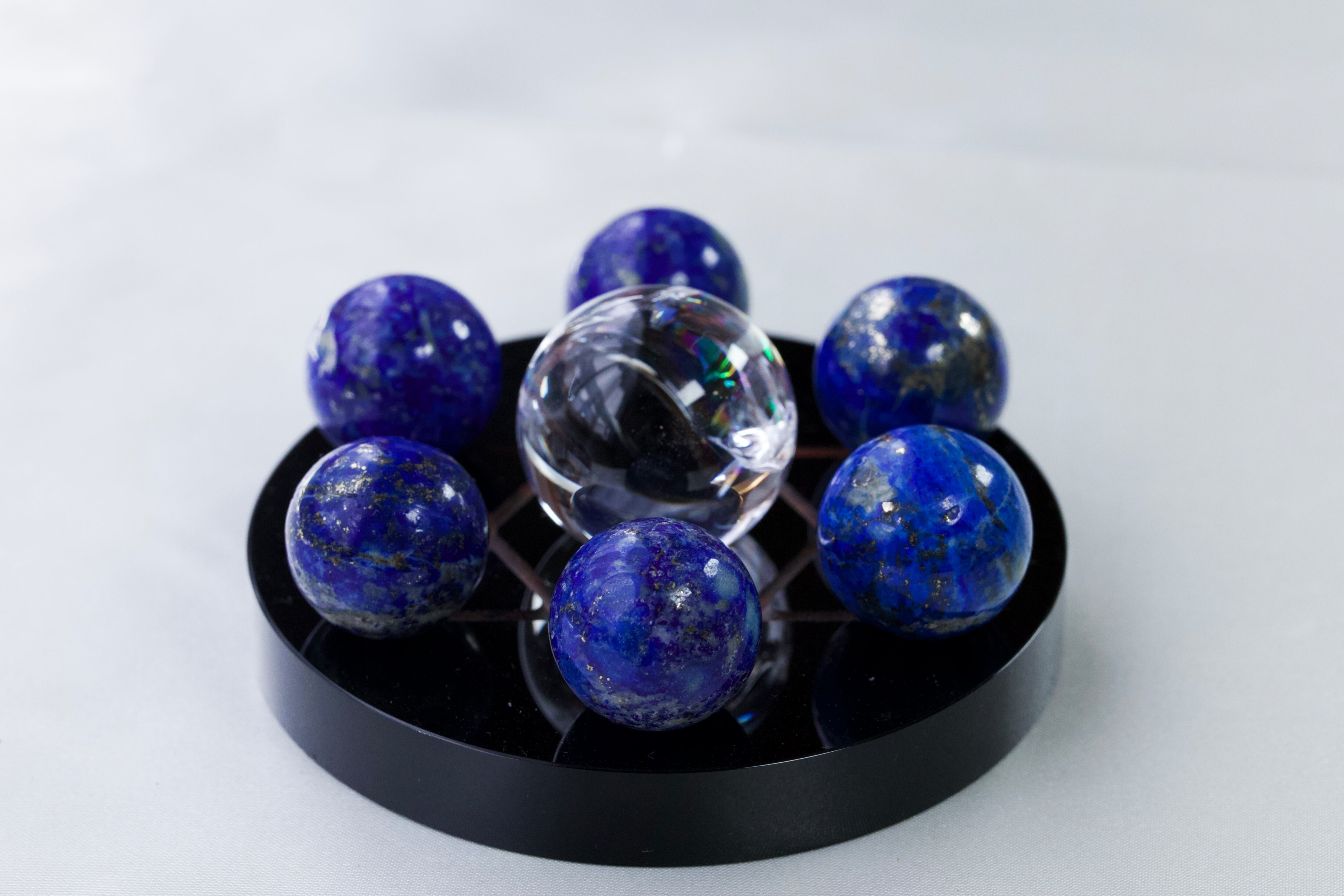 ✸オブシディアン製の七星陣の上に、ラピスラズリの丸玉が6個、中央にアイリスクォーツが乗ったセットになります。