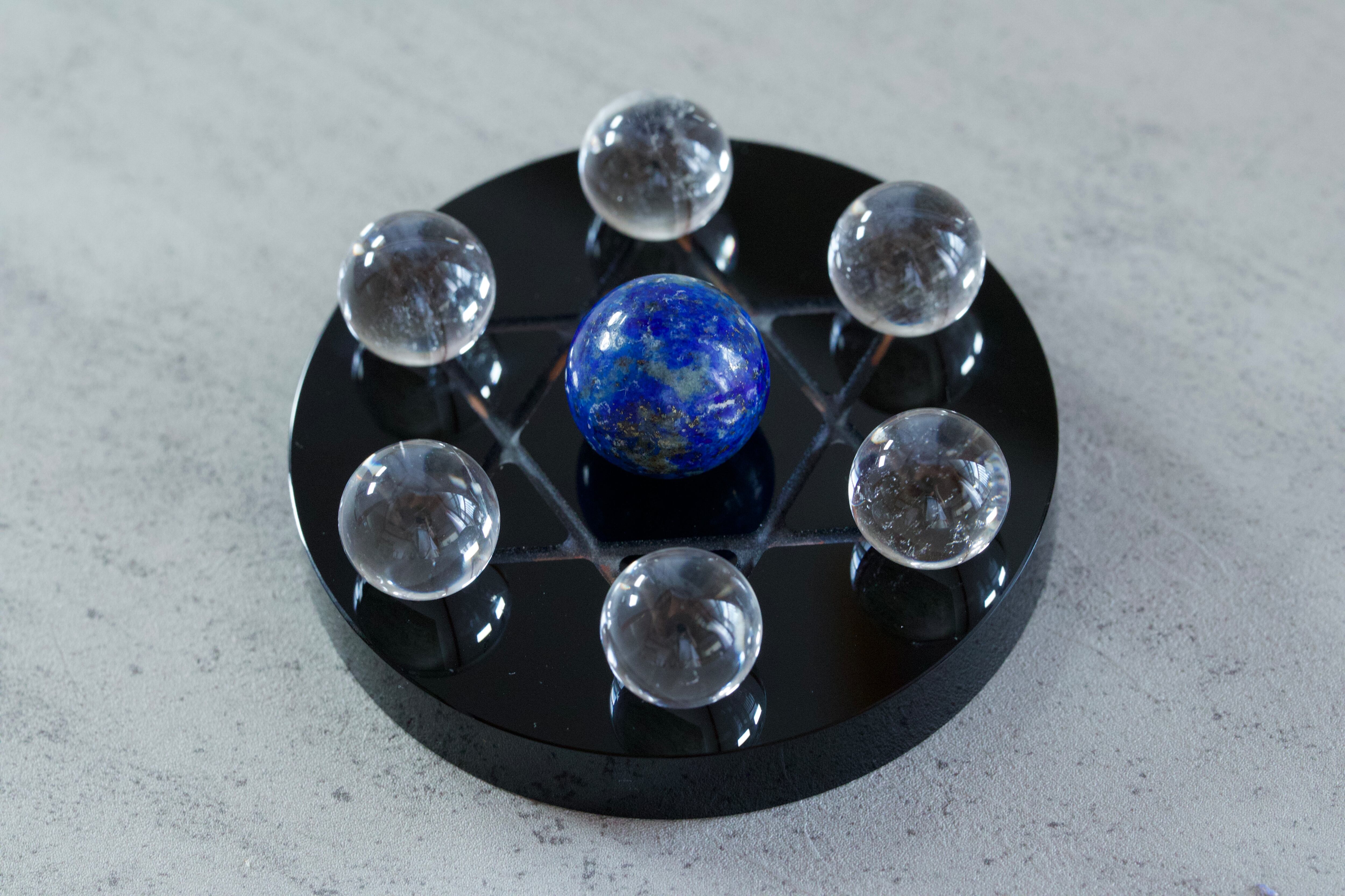 ✸オブシディアン製の七星陣の上に、透明度の高い水晶の丸玉が6個、中央にラピスラズリが乗ったセットになります。