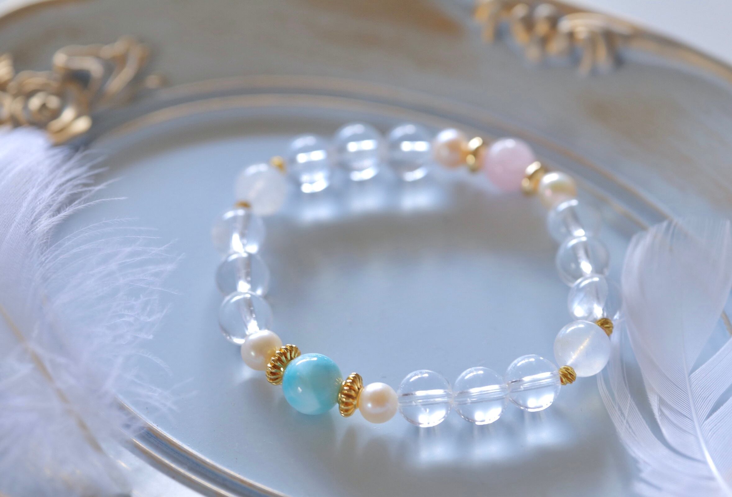 高品質なラリマー、モルガナイト、ムーンストーンを使用したブレスレットです。